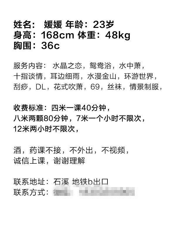本人跟照片一样,属于成熟丰满型,可以舌吻、69、吞jing。服务态度好,不JC。微信约好,由于开房在